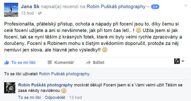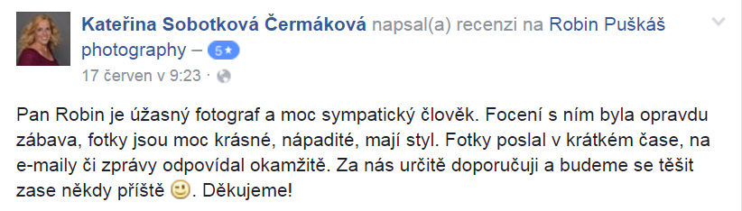 Hlavním a nejdůležitějším kritériem pro váš výběr fotografa na tak významný den jako je ten svatební by zcela jistě měly být recenze, reference, názory na jeho práci a spolehlivost. Pokud z veřejných zdrojů nelze dostatečně zjistit, co na vybraného fotografa říkají jeho klienti, je to určitě údaj k zamyšlení. Samozřejmě může existovat mnoho fake hodnocení či reakcí na objednávku, ale toto rozhodně není můj případ. Nemám to zapotřebí. Za mne hovoří moje práce, kterou dělám s láskou a maximální snahou být co nejvíce profesionální. Spokojenost mých klientů mi je pak největší odměnou.